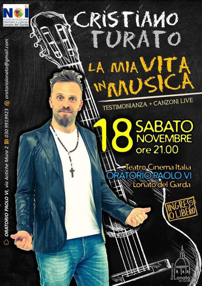 Sabato 18 novembre alle ore 21.00 al Teatro Italia dell'Oratorio Paolo VI di Lonato del Garda: "TESTIMONIANZA IN MUSICA" di CRISTIANO TURATO (voce dei Nomadi dal 2012 a febbraio 2017).