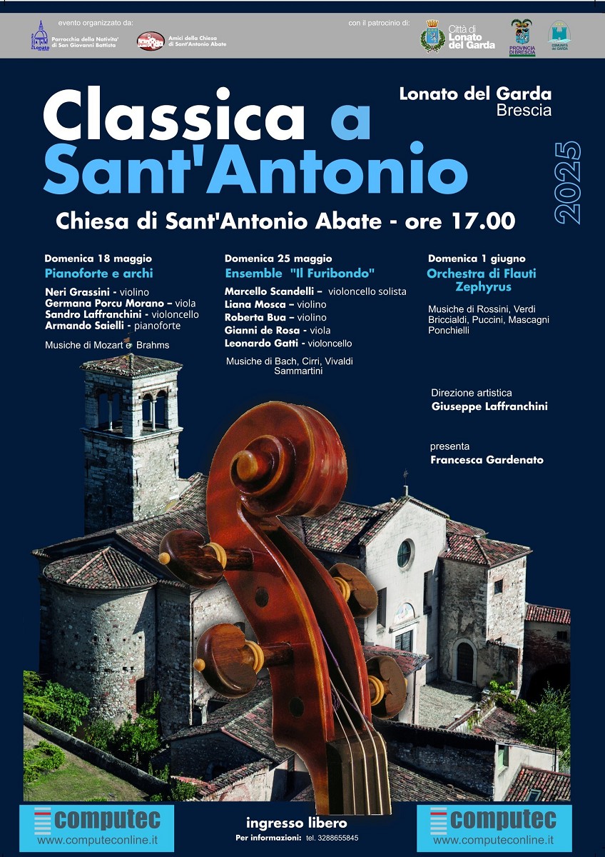 Torna a maggio l’atteso appuntamento con la rassegna musicale CLASSICA A SANT’ANTONIO, un ciclo di concerti da camera di alta qualità ospitato nella suggestiva cornice della chiesa di Sant’Antonio Abate a Lonato del Garda. Ideata nel 2008 e diretta con passione e competenza dal M° Giuseppe Laffranchini, già primo violoncello del Teatro alla Scala di Milano, la manifestazione è divenuta negli anni un punto di riferimento per gli amanti della musica classica. L’edizione 2025 vede protagonisti interpreti di livello internazionale, tra cui Sandro Laffranchini, figlio del direttore artistico, anch’egli primo violoncello alla Scala, che si esibirà nel concerto inaugurale insieme a Neri Grassini (violino), Germana Porcu Morano (viola) e Armando Saielli (pianoforte). Il programma prevede due capolavori del repertorio cameristico: il Quartetto per pianoforte n. 1 K 478 di Mozart e il Quartetto op. 60 di Brahms. La rassegna, promossa dagli Amici della Chiesa di Sant’Antonio Abate con il sostegno della Parrocchia della Natività di San Giovanni Battista e dell’Assessorato alla Cultura del Comune di Lonato del Garda, gode del patrocinio della Provincia di Brescia e della Comunità del Garda. La Chiesa di Sant’Antonio Abate, in pieno centro storico e inserita in uno scenario architettonico-naturalistico unico, offre al pubblico non solo un’acustica apprezzata dagli artisti, ma anche un’atmosfera raccolta che favorisce uno straordinario contatto diretto con i musicisti.