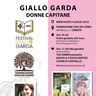 Giallo Garda – Donne Capitane Mercoledì 9 luglio 2025 Nei Giardini della Fondazione Ugo Da Como, Tea Ranno presenta i libri Avevo il fuoco dentro e Cuore di cristallo. Ore 19.30 visita guidata alla Casa (€8, su prenotazione) Ore 21.00 presentazione nei giardini (ingresso libero) Info: segreteria@festivalgiallogarda.it – 320 1560066