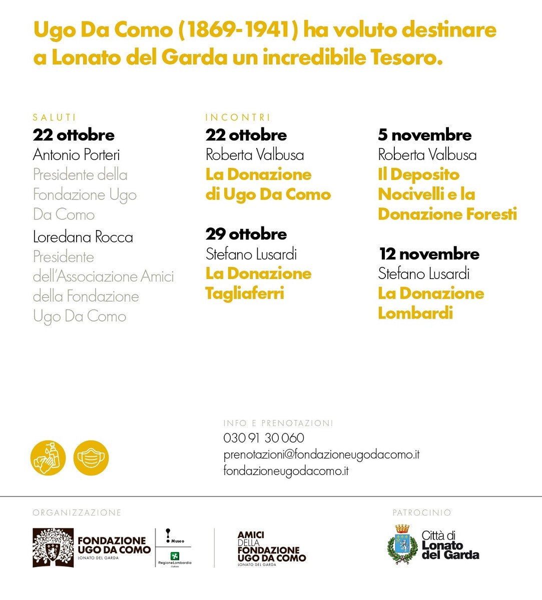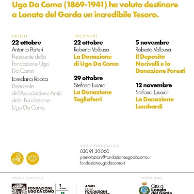 La Fondazione Ugo Da Como, con l’associazione di volontari Amici della Fondazione Ugo Da Como e il Patrocinio dell’Assessorato alla Cultura del Comune di Lonato del Garda organizza tra ottobre e novembre una serie di 4 incontri pubblici dedicati al “tesoro” custodito dall’Istituzione voluta dal Senatore bresciano.